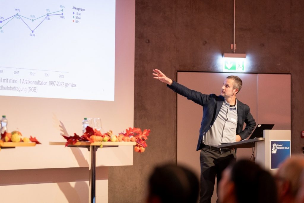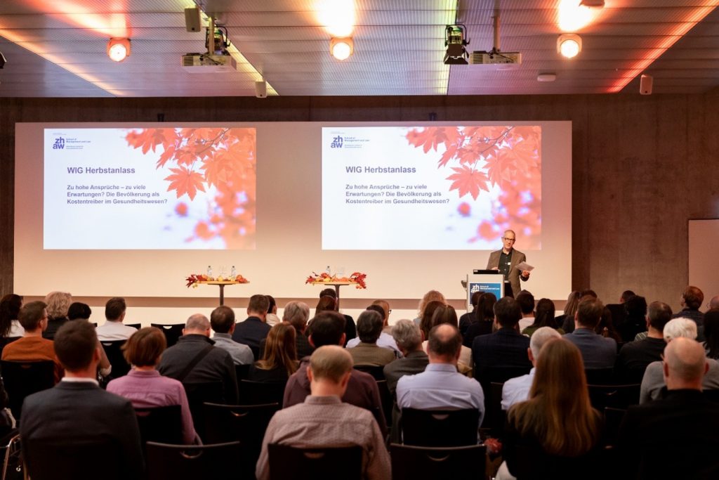 Marc Höglinger, Teamleiter am WIG, präsentierte die aktuellen Zahlen und den Stand der Forschung zum Thema des Abends. So haben drei Viertel der Bevölkerung einen Anteil von nur 10% an den prämienrelevanten Kosten und tragen somit kaum zum Kostenwachstum bei. Gleichzeitig zeigt eine aktuelle Studie des WIG, dass die höheren Kosten pro erkrankte Person Haupttreiber des Kostenwachstums sind. Das heisst aber nicht, dass die zusätzlichen Leistungen aufgrund von Ansprüchen der Patienten erbracht wurden. Vielmehr deutet der aktuelle Stand der Forschung darauf hin, dass anderer Faktoren einen stärkeren Einfluss haben, und die Erwartungen und Ansprüche der Bevölkerung kein zentraler Kostentreiber im Gesundheitswesen sind.