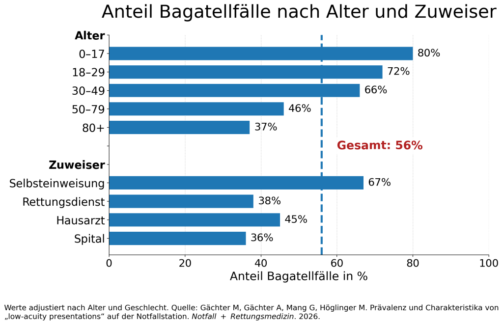 Wir haben dazu 1’247 Notfallkonsultationen aus dem Jahr 2023 analysiert. Das Ergebnis: 56 Prozent waren Bagatellfälle. Es handelt sich um sog. Low-Acuity Presentations (LAP), die keine Computertomographie (CT), Magnetresonanztomographie (MRT), invasive Diagnostik oder Operation benötigten. Es sind also Fälle, die auch eine gut ausgestattete Hausarztpraxis hätte behandeln können. Unsere LAP-Definition ist bewusst eng gefasst: Erst wenn Leistungen, die nur in einem Spital durchgeführt werden können – etwa erweiterte Bildgebung oder stationäre Aufnahme – nötig werden, zählt ein Fall nicht als LAP. Wichtig ist: Nicht alle LAPs sind ungerechtfertigt im Spital. Multimorbidität, funktionelle Einschränkungen oder fehlende soziale Unterstützung können auch scheinbar einfache Fälle zu Notfallpatienten machen – unsere Definition berücksichtigt diese (schwer messbaren) Kontextfaktoren nicht.