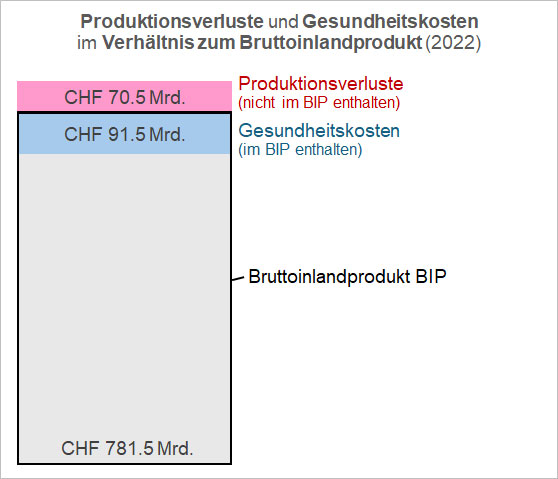 Die Produktionsverluste betreffen hingegen primär Unternehmen und Personen, die aus gesundheitlichen Gründen nicht oder nur eingeschränkt arbeiten können. Dieses verlorene Einkommen ist aber nicht Teil des BIP. Ohne Produktionsverluste wäre das BIP deutlich grösser.