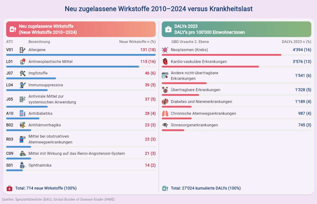 Abbildung 2: Vergleich der zehn grössten neuen Wirkstoffgruppen (2010–2024) mit der Krankheitslast (DALYs pro 100‘000 Einwohner:innen) in der Schweiz im Jahr 2023 (Quelle: Spezialitätenliste (BAG), Global Burden of Disease-Studie (IHME)).