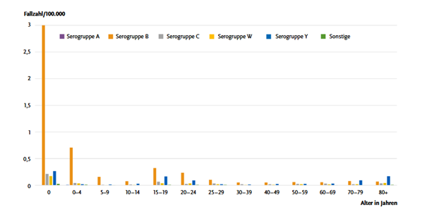Um diesen Unterschied zu verstehen, lohnt sich ein kurzer Blick auf Krankheit und Impfung. Meningokokken sind Bakterien, die häufig den Nasen-Rachen-Raum besiedeln, ohne krank zu machen. Nur selten kommt es zu invasiven Erkrankungen wie Hirnhautentzündung oder Blutvergiftungen, dann aber oft mit sehr raschem und schwerem Verlauf. Die Serogruppe B ist in Europa eine wichtige Ursache solcher Erkrankungen (Abb. 1).