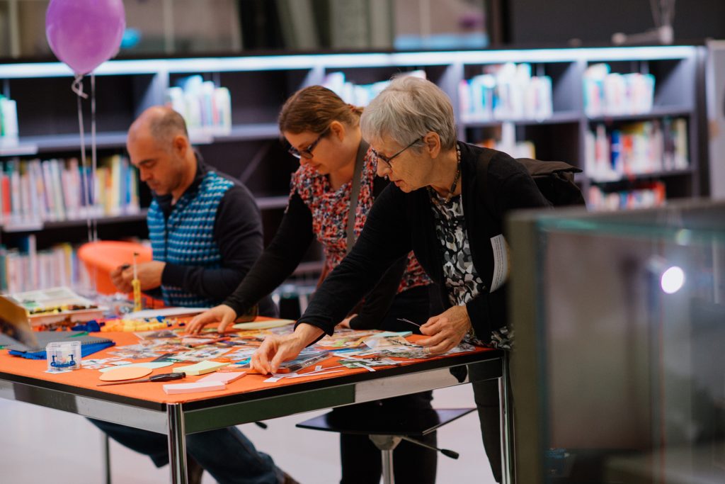 Das Open House war interaktiv gestaltet: Besucher:innen beim Kreieren ihrer Vision einer Bibliothekszukunft; Fotos von Caroline Krajcir (2025).