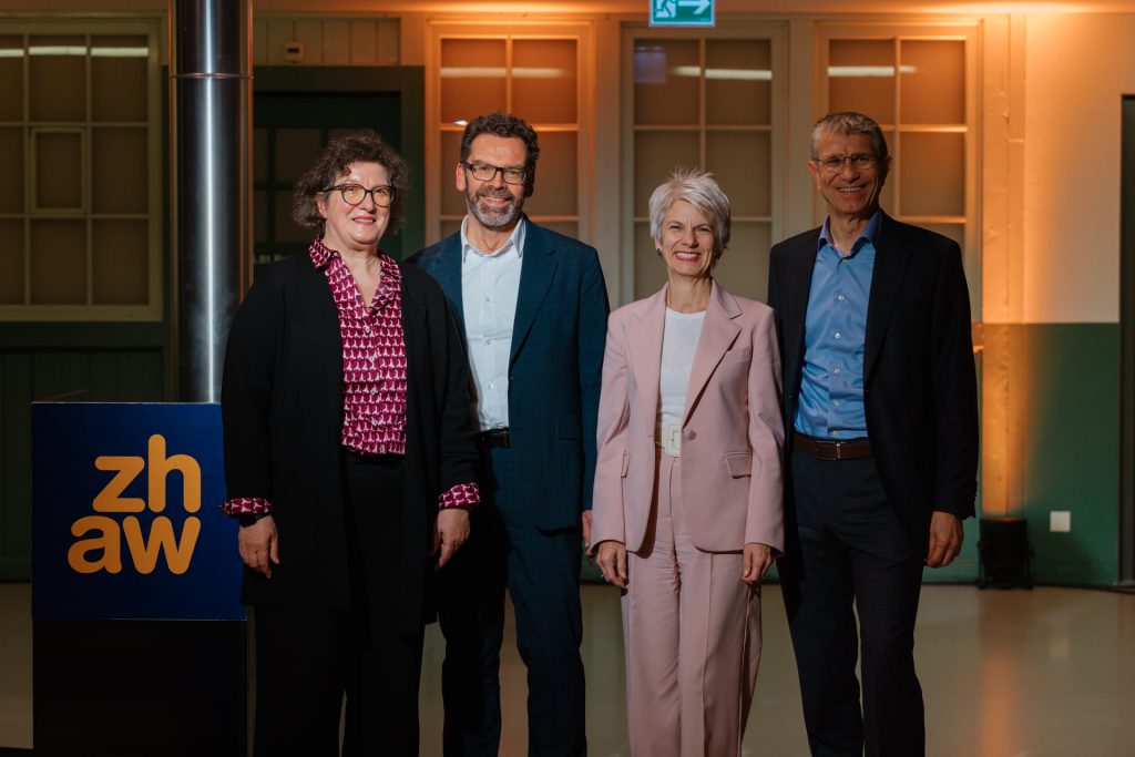 V.l.n.r.: Gabriela Lüthi (Leiterin ZHAW Hochschulbibliothek), Rudolf Mumenthaler (Direktor Universitätsbibliothek Zürich), Regula Jöhl (Rektorin ZHAW), Reto Schnellmann (ehemaliger Verwaltungsdirektor ZHAW); Foto von Caroline Krajcir (2025).