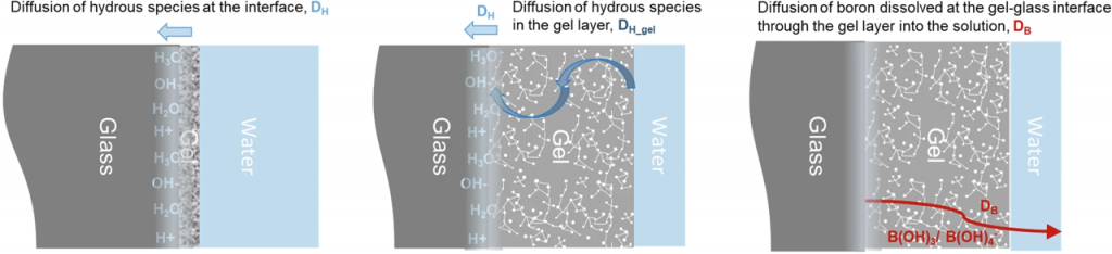 As the glass meets water, it forms a porous, silica-rich gel. Over time, the gel’s pores coarsen and become less connected, which makes it harder for water and dissolved species, especially boron, to move. That reduced transport is the key reason the glass alteration rate keeps dropping with age. Techniques like cryo-TEM, SAXS, ToF-SIMS, and stable-isotope tracing (¹⁸O and ¹⁰B) let us watch this evolution and quantify the slow-down.
