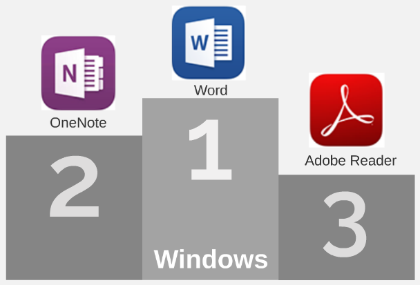 Die Windows-NutzerInnen mit dem Dell Venue 11 Pro nutzen in erster Linie Microsoft Word und OneNote, gefolgt vom kostenlosen Adobe Reader für die Bearbeitung von PDFs. Diese drei Programme kommen in allen Lernphasen vor; sowohl im Unterricht und in den Labors als auch im Selbststudium und in der Prüfungsvorbereitung.