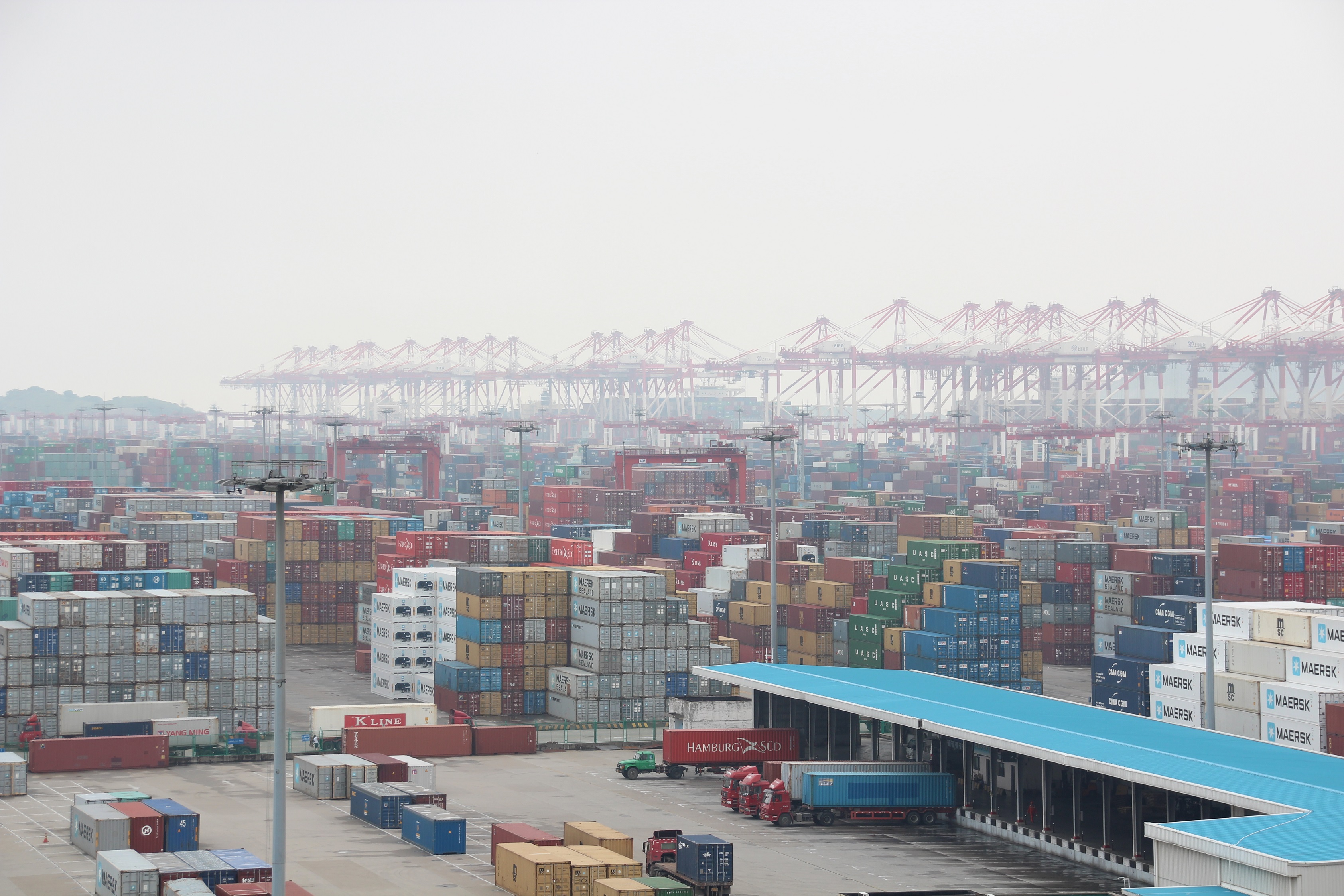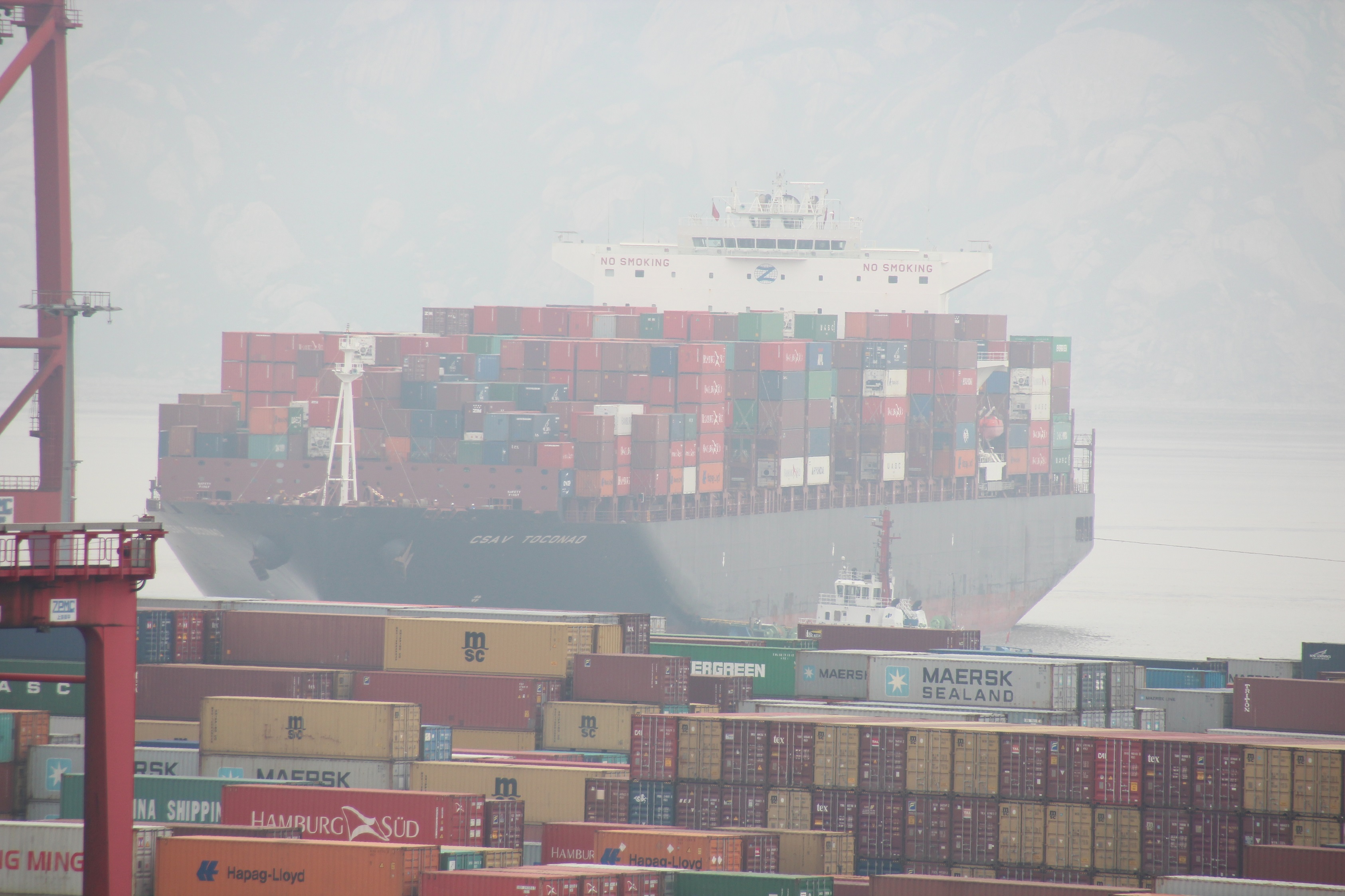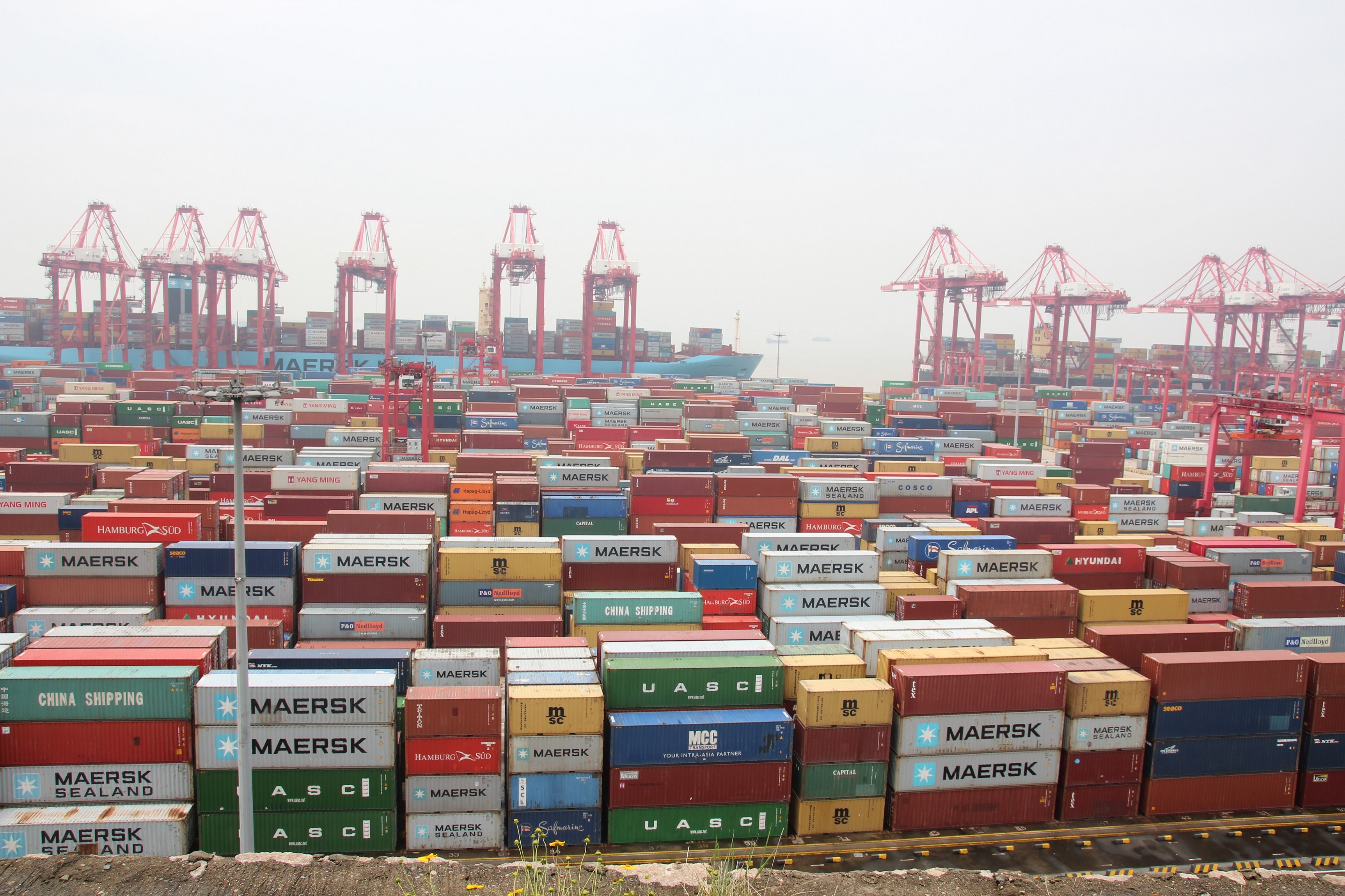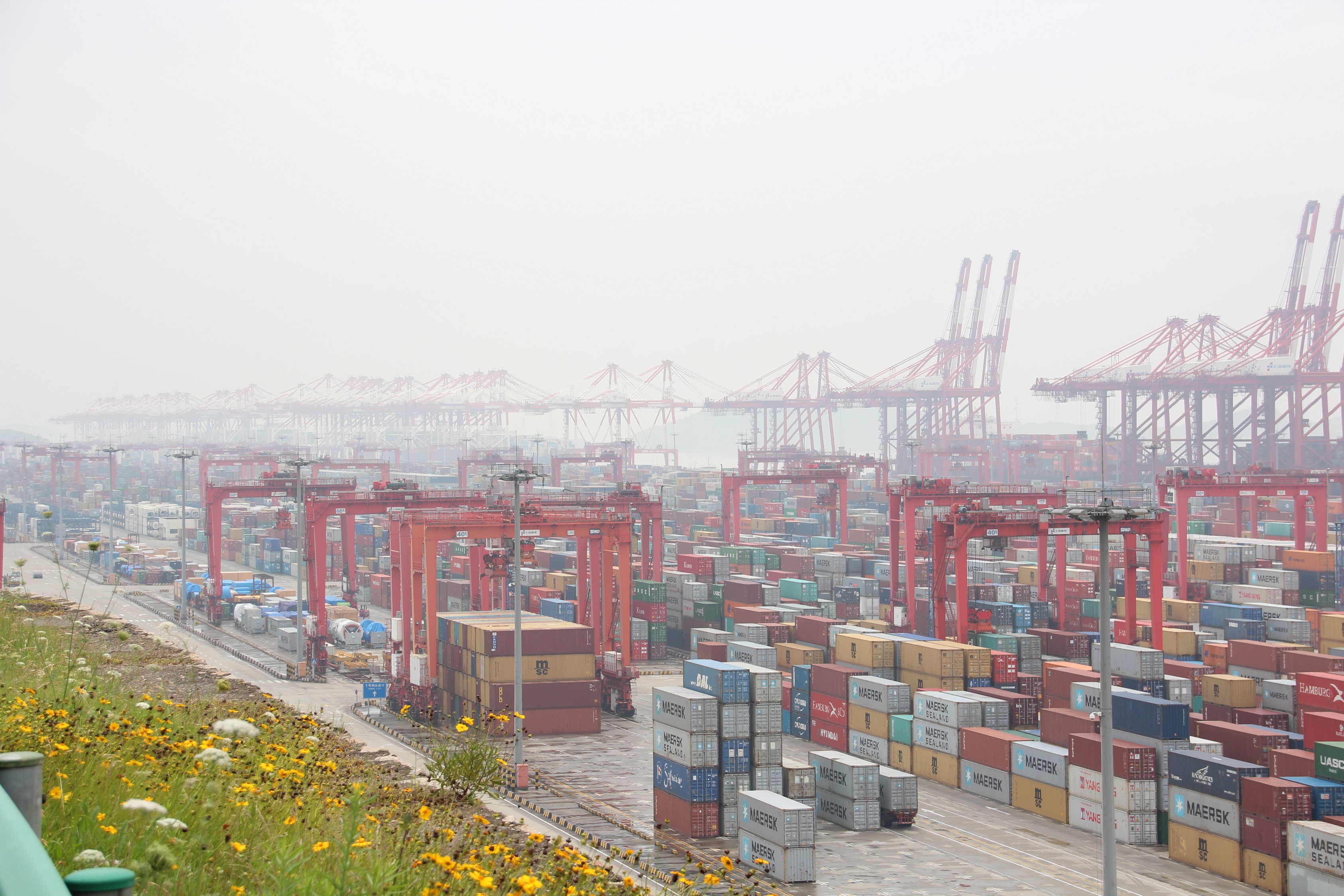 After a good night’s rest from the previous evening, we were picked up at the hotel to be driven to the port. As we later were told the port of Shanghai is not a consecutive site but rather split up in several unique sites that were located around the Shanghai area. Indeed, we were brought to the newest expansion of Shanghai port infrastructure – Yangshan Port. Located on an island surrounded by 15-meter deep water to allow even the biggest of all transport ships to dock and load their precious goods. To get there we were heading southwards to the ocean right through the city of Shanghai. This journey once again enabled us to try to grasp the unbelievable vastness and growth of this city or rather China as a whole. Grasping the sheer speed at which China grows (or has grown so far) became even harder once we realized that the by fog engulfed bridge we were driving on was not simple any bridge. It was a 32.5-kilometer-long bridge right through the ocean that connected the main land with Yangshan Port. This alone already made an impressive achievement (2x the length of the Gotthard tunnel), but the fact that it was built in only 2 years (!) finally made most of us realize the true commitment China invests in its growth.