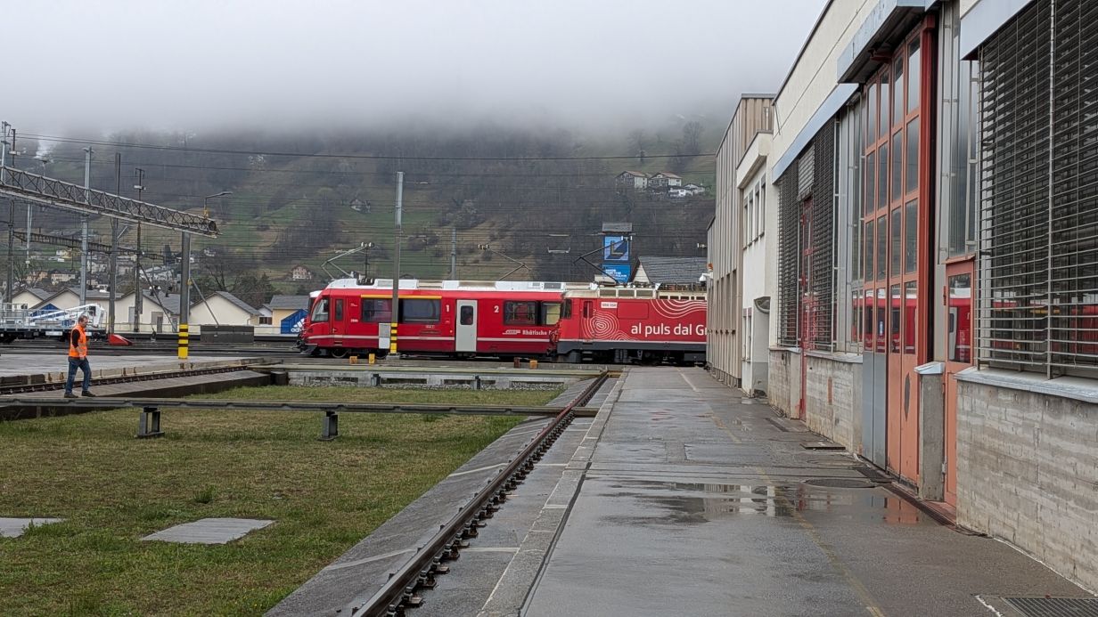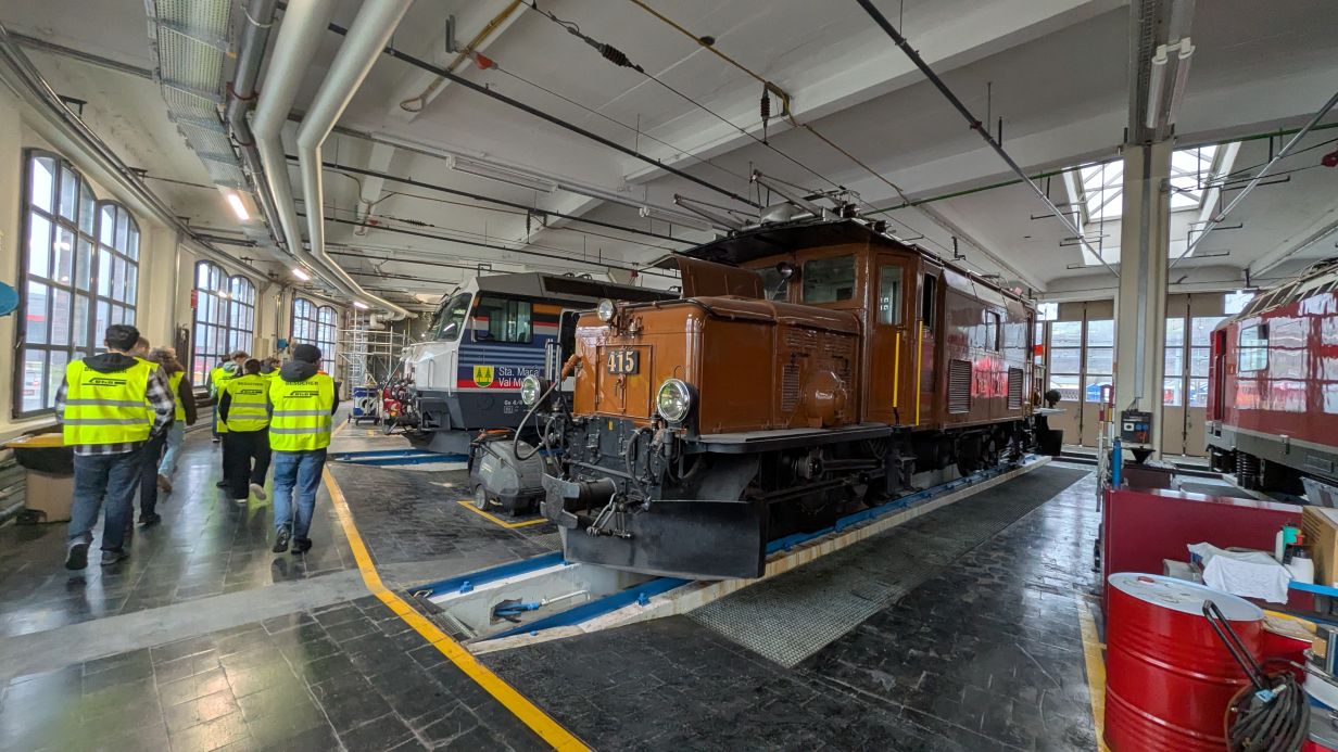 Der Tag begann in Landquart mit einer Führung durch die Instandhaltung. Dabei standen das Rollmaterial, der Wechsel von Drehgestellen sowie die Abläufe in den Wartungshallen im Fokus. Anschliessend wurde die RhB umfassend vorgestellt – von ihrer Geschichte bis hin zu aktuellen Herausforderungen und innovativen Projekten.